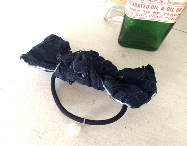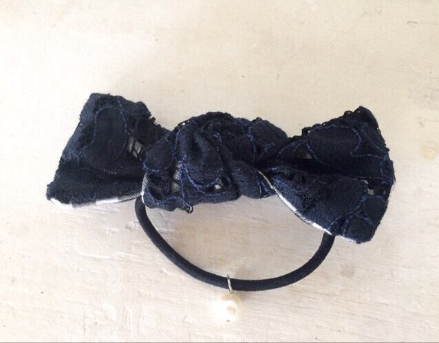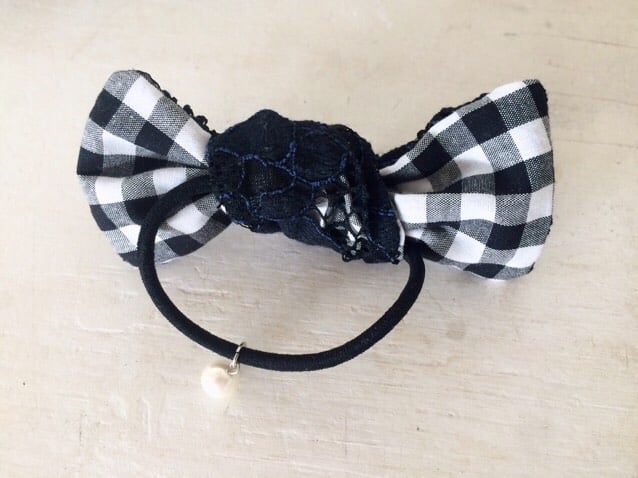 レースからのぞくギンガムチェックが可愛らしいリボンタイプのヘアゴム