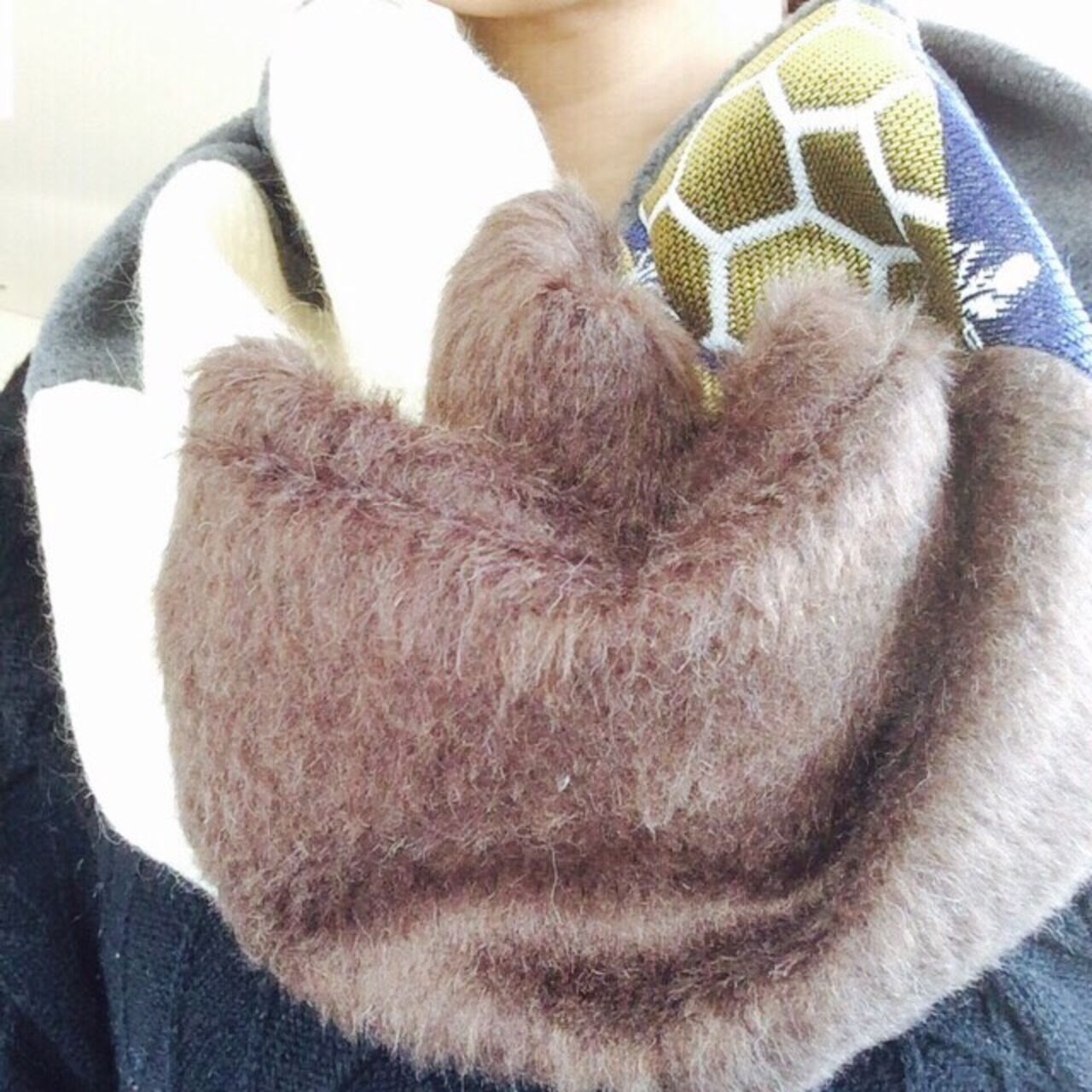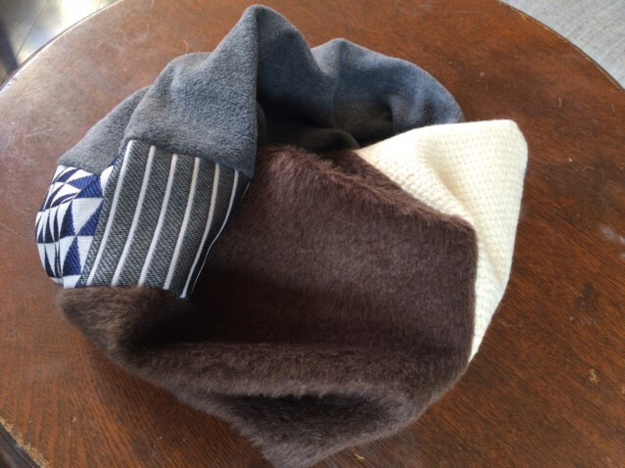 いろいろな素材の生地を組み合わせてたスヌード。 ねじって作っているので首に添いやすくなってます。 サイズ 約35×80㎝