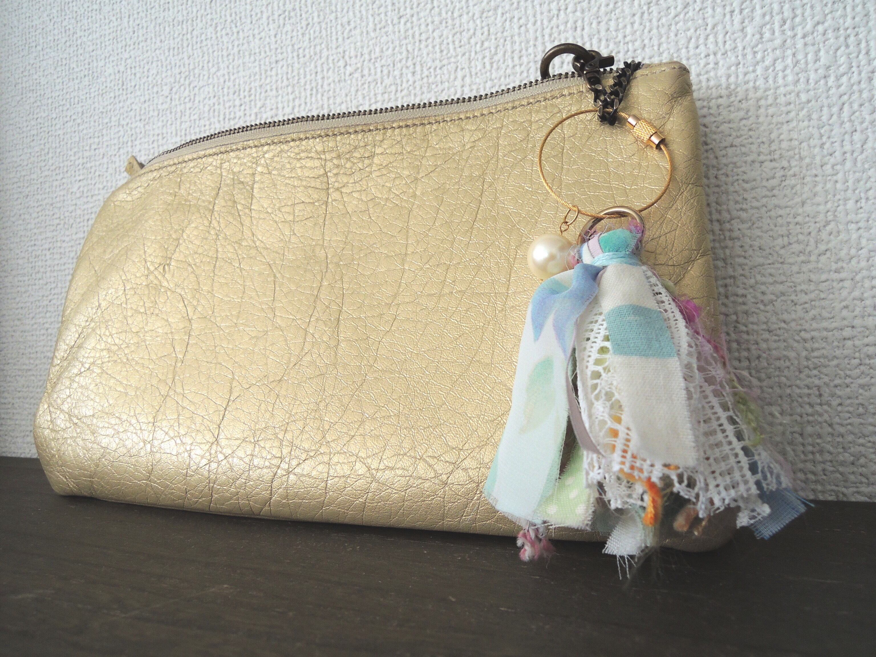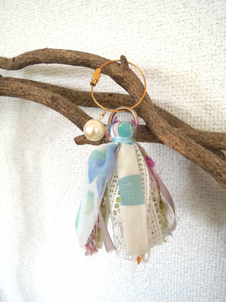 レースやリボン、いろいろな素材を組み合わせたタッセルをキーリングにしました。