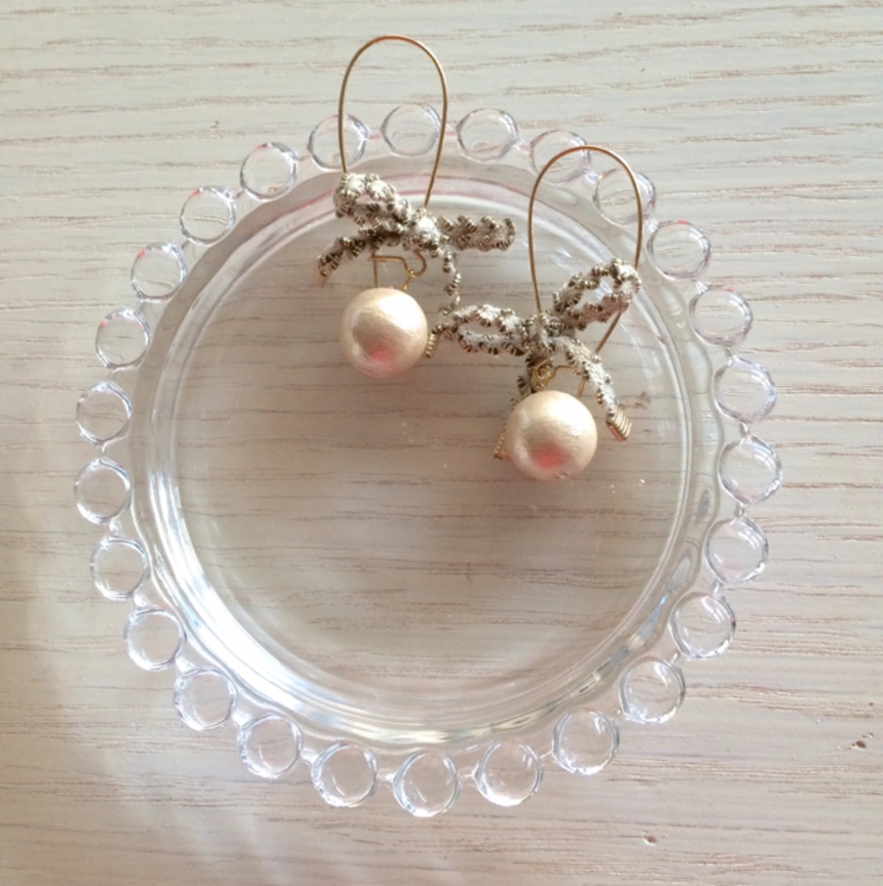 蝶々結びのリボンとコットンパールのフープピアスです。